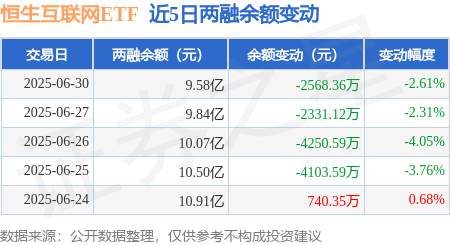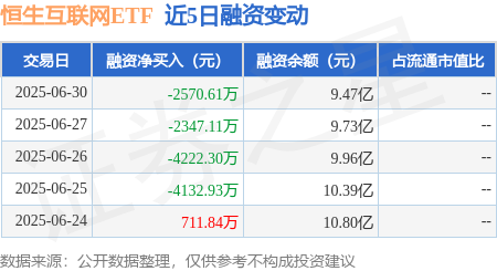 本站消息,6月30日,恒生互联网ETF(513330)融资买入2.39亿元,融资偿还2.65亿元,融资净卖出2570.61万元,融资余额9.47亿元。